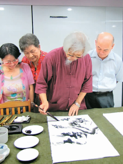 第一次与王太田先生见面,是在夏日的一个午后,在台北“国父纪念馆”西文化艺廊。那天,太田先生所带学生的结业画展在这里揭幕,这也是34年来,太田先生在此业余教授的第三十四期生活美学国画山水班学生的作品展览。记者发现,这30位“老学生”,虽然最小的已年逾花甲,最大的101岁,但是,簇拥在须发皆白的太田先生身边,完全是一副“小学生”的虔敬模样。他们一边仔细观摩老师示范作画,一边认真聆听老师教诲:画山水画时,自己心中首先要有一幅山水画,画作要先感动自己才能感动别人。