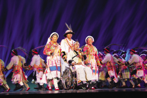 傈僳族群舞《轮椅上传承的阿尺木刮》编导兼主演余勇兴坐在轮椅上传承民族舞蹈的故事,打动了无数观众。