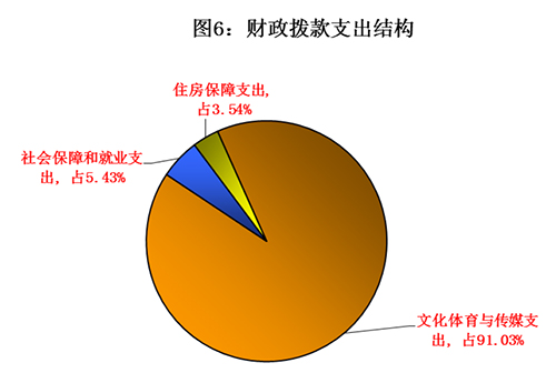 电竞竞猜2016年度财政拨款支出19343.23万元,主要用于以下方面:文化体育与传媒支出17608.86万元,占财政拨款支出的91.03%;社会保障和就业支出1049.63万元,占财政拨款支出的5.43%;住房保障支出684.74万元,占财政拨款支出的3.54%。