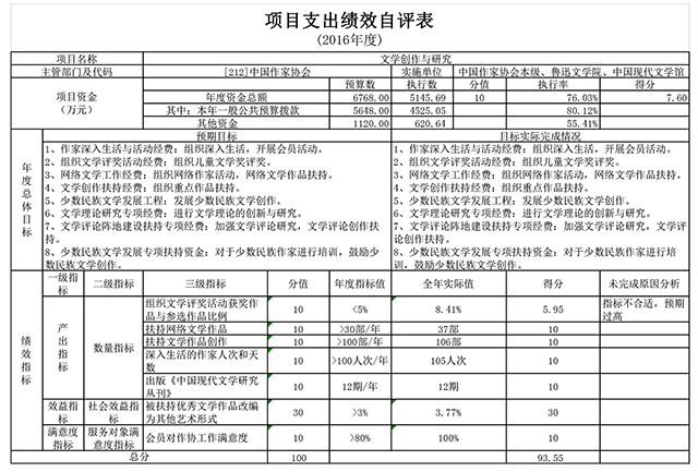 根据年初设定的绩效目标, “文学创作与研究”项目自评得分为93.55 分。发现的主要问题及原因:一是年初设置的个别指标不合理;二是部分二级项目执行进度较慢。下一步改进措施:增强指标设置的科学性,加快预算执行进度。