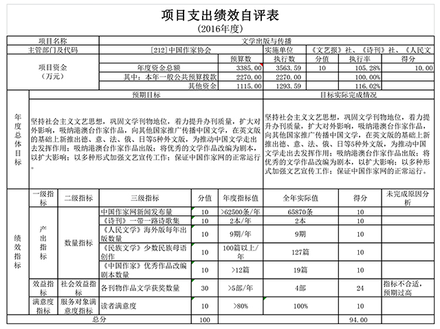 “文学出版与传播”项目自评得分为94 分。发现的主要问题及原因:部分绩效指标设置预期偏高,预算执行过程中完成难度较大。下一步改进措施:结合实际情况,合理设置绩效目标。