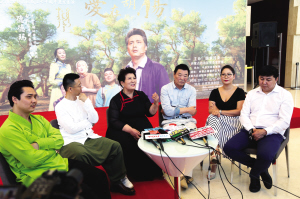 德德玛(左三)和《爱在胡杨》主创人员接受媒体采访。 王珍摄