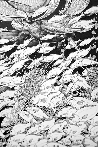 无论是人化鱼还是鱼化人,都隐藏了作者有意与当下社会拉开距离的企图。这种抽离与传统的渔隐文化呈隔空呼应之势。古人观鱼,常以鱼的从容、自在和率性表达自己对自由的追求以及对生命最高境界的理解。“江南可采莲,莲叶何田田。鱼戏莲叶间,鱼戏莲叶东,鱼戏莲叶西,鱼戏莲叶南,鱼戏莲叶北。”是鱼之乐,亦是人之乐。“西塞山前白鹭飞,桃花流水鳜鱼肥”,张志和的《渔父歌》,以渔夫悠闲自在的生活点明心中归隐之志。以渔樵为典型象征意象的渔隐文化,寄托了人们隐逸江湖、逍遥人生的志趣与追求,给人带来一种自由的人生况味。想必香港人心中总有一丝不自由之戾气,方衍生出以上种种层出不穷的借鱼遁世愿想。