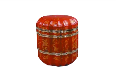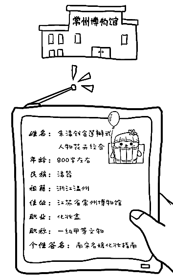 小女子来自江苏省的常州博物馆,是用漆树的汁液涂在器物的表面制成的器物,身份证上名叫“南宋朱漆戗(音“呛”)金莲瓣式人物花卉纹奁”。这么复杂的名字是文物专家们为了准确描述我的特征而取的全名。起这种又长又难读的名字,上课老师提问一定不会点到我吧?
