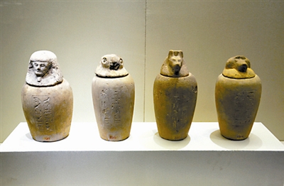 尼罗河孕育的古埃及文明史构成“文明之海”的重要篇章。提到埃及,除了金字塔,人们大概会想到木乃伊吧。古埃及人视死亡为新生的起点,渴望生命不朽。他们在制作木乃伊时,会将尸体的内脏取出,处理后放入容器内保存。这种用于保存死者内脏的容器称为卡诺皮克罐,与石棺及其他葬礼用品一起摆放在墓室里,一般是以石灰石或陶制成的平底罐形,颈部稍宽,以塞子封口。从新王国时代起,封口的塞子就做成了代表荷鲁斯四个儿子相应的人和动物形象。分别是:人形守护神伊姆塞特,保护肝;狒狒模样的神哈匹,保护肺;鹰头模样的神凯伯塞努夫,保护肠;豺狼头模样的神杜瓦姆太夫,保护胃。在将尸体制成木乃伊的过程中,肝、肺、肠、胃都会被移除,分别保存在这四个罐中。在古埃及人眼里,来世与人间一样,对秩序的要求都是至高无上的。