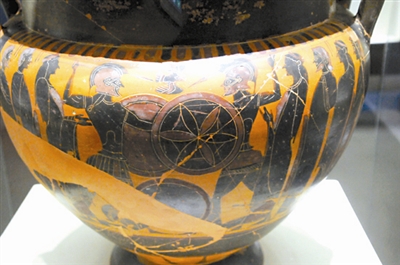 这件古希腊陶杯,描绘的是为争夺一具尸体进行的决斗。谁的尸体?他是怎么死的?哪些人在决斗?为什么决斗?死者名叫帕特罗克洛斯,是希腊名将阿喀琉斯的好朋友。阿喀琉斯与希腊联军统帅阿伽门农因为女战俘分配不均而争执,愤怒地退出战斗。没有阿喀琉斯,希腊联军节节败退,为了希腊,帕特罗克洛斯穿上阿喀琉斯的铠甲上阵,结果被特洛伊王子赫克托耳杀死。阿喀琉斯为报杀友之仇,重返战场。赫克托耳与阿喀琉斯交锋,不敌而逃,阿喀琉斯围着特洛伊城追了三圈,杀死赫克托耳,并用战车拖辱尸体,惨不忍睹。特洛伊国王普里阿姆只身前往敌营,跪在阿喀琉斯的脚下,用重金、哀求、真情打动阿喀琉斯,讨回儿子的尸体。双方休战,各自举行葬礼。死亡平息了阿喀琉斯的愤怒。