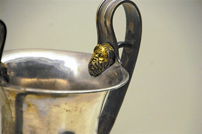 会饮是古希腊一项历史悠久的文化古风,在荷马时代就可见到些许端倪,大家通常在竞技或者节日之后聚在一起,一边观赏娱乐,一边吃饭喝酒,聊些轻松愉快的话题。饮酒的器具则彰显了主人的地位,康塔罗斯酒杯是一种带有两个高柄的大酒杯,为饮酒的最佳器皿,因此被认为是狄奥尼索斯的标志之一。这只康塔罗斯酒杯来自罗希尼奥,是现存于世的极少数几只珍贵金属器皿之一,也是大希腊地区出土餐具中的大型酒器的经典之作。