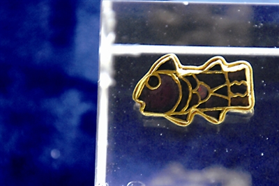 拜占庭以金银首饰出名,在君士坦丁堡,东罗马宫廷为保证奢侈品质量,控制了金匠和银匠的活动,将其组织到作坊中,严格确保使用的材料纯度。古代作家经常提到教堂和皇宫装满了金器,拜占庭贵族的长袍也用宝石和黄金来装饰。眼前这件鱼形胸针产自墨洛温地区,采用几何形状展现出动物的身体构造。石榴石由黄金薄片点缀。此处使用的镶嵌技术起源于古典时代晚期,这一时期较为常见;它以动物装饰或者圆形装饰的形式被应用于胸针上。