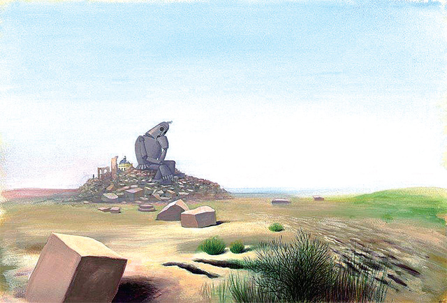 影片的结尾更令人深思:小鸟成功驾驭着机器人将国王夏尔十六扔到了千里之外。塔基卡迪王国的一切都被夷为平地,放眼望去,一片荒芜,飞舞着的尘埃轻轻撞击着废墟。一切都消失了,小鸟、牧羊女、扫烟囱的人、狮子、老虎以及其他被奴役的人……他们全都不见了。惟一守护在废墟旁的是巨大的机器人。一只鸟笼在它的手边,沉思的机器人用尽力气砸碎了牢笼,释放了这只小鸟。