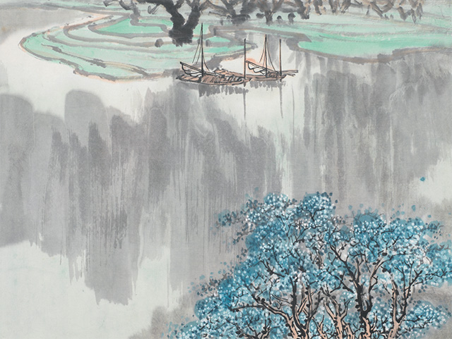 新中国成立以后,山水画家们在新的历史背景下,开始了思想更新与画法创新,使古法山水在社会现实和革命需要中呈现出前所未有的崭新面貌。在社会主义文艺方针的指导下,画家们开始自觉表现社会主义带来的新气象,以傅抱石、钱松岩为首的新金陵画派更以地域集体的力量推进社会主义文艺的新发展,他们从写生出发,讴歌时代,抒发感怀,在表现内容和手法上都达到了历史的新高度。伍霖生作为新金陵画派的重要成员,自然地参与到了这个艺术史变革的洪流中去。
