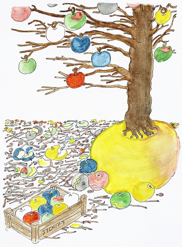四周悄然无声,苹果树亭亭玉立,俨然一杆宝幡,绿森森地荫着人们。 (出自《方岛·譬喻》)
