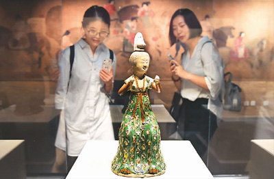 º¼ÖݾÙÐС°Ò»ÈÕ¿´¾¡³¤°²»¨¡ª¡ªÌƶ¼³¤°²Èý²Ê¾«»ªÕ¹¡±¡£Í¼Îª¹ÛÖÚÔÚÐÀÉÍ¡°Èý²ÊÓÔÌÕÊá×±Å®×øÙ¸¡±¡£ Àî ÖÒÉ㣨лªÉç·¢£©