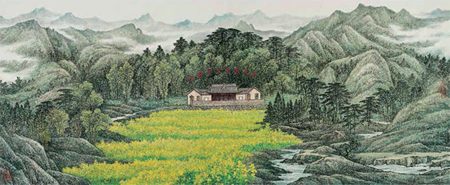 “文艺是时代前进的号角,最能代表一个时代的风貌,最能引领一个时代的风气”。这是习近平总书记在文艺工作座谈会上的重要讲话中所强调的。董希源多年来的红色写生,自觉践行总书记的讲话精神,写生成果是多方面的。通过写生,他不但丰富、夯实了个人的创作,也进一步体悟到“艺术可以放飞想象的翅膀,但一定要脚踩坚实的大地”的深意,懂得了“人民是历史创造者”的道理,认识到如何才能“为人民抒写、为人民抒情、为人民抒怀”。他用栩栩如生的作品形象向人们讲述我党我军的光荣历史,呈现出这个时代的主旋律。董希源这批大尺幅红色题材写生作品,倾注心血,饱含深情,以他对传统国画研修所积累的学养,以自身对艺术创作规律的感悟和对艺术本体精神内涵的理解,在红色历史题材的写生与创作两个命题的结合上,在传统笔墨表现当代意境方面做出了诸多有益的探素。特别是他的倾情力作《万里海疆图》更是令人印象深刻。这件37米长的作品紧紧围绕习近平总书记提出来的“听党指挥,能打胜仗,作风优良,努力开创强军兴军新局面,实现中华民族伟大复兴的强国梦、强军梦”这个创作主题,采用全景式的表现手法,以大视野俯瞰的视角,详细描绘了在陆海空、火箭军和战略支援部队组成的钢铁长城坚强有力的保卫下,从我国北疆的阿尔山市三角山边防哨卡到最南端的曾母暗沙等的万里海疆壮丽秀美、和平发展、生机勃发的宏大场面。可以说,这部长卷是近年来我国红色题材创作中难得的一件具有史诗品格、彰显中国精神、催人奋进的佳作。