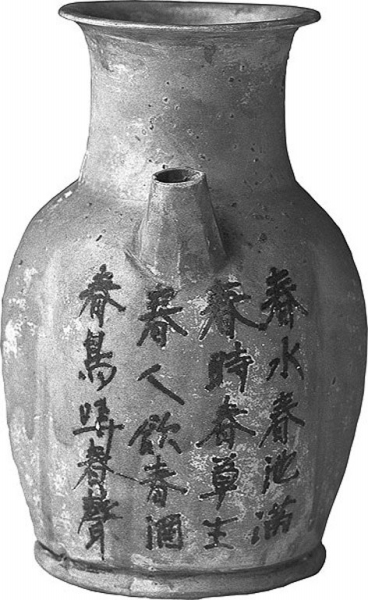 铜官窑器偏黄色,虽以釉下彩胜出,毕竟起步晚了几百年。不如邢、越二窑工艺底子厚,大批量生产的民间日用器物也难及官窑出产的贡瓷那般类冰似玉的精致细巧。可窑工们对自己双手做出来的东西就有这样珍重的心思:“买人心愁怅,卖人心不安。题诗安瓶上,将与买人看。”这是拿着余温犹在的窑器面对买家,一边兜售一边不舍放手的情态。还有“龙门多贵客,出户是贤宾。今日归家去,将与贵人看。”(末句又作“无言谢主人”)完全用器物的口味,娓娓地矜然自夸。对它们未来的买家也有这样诚挚的祝福:“上有东流水,下有好山林。主人居此宅,可以斗量金。”——不论买主是不是迷信,懂不懂风水,刻着这样一首祝语诗的器物放在家里,自己每天用一次念一遍,客人来了看一眼念一遍,总是不会有错的啊。朝鲜龙媒岛出土的两件铜官窑器,一件上面题着在今天读来依然威风八面的广告词:“卞家小口,天下第一”,另一件只有一字之差,变成“郑家小口,天下第一”。“小口”是提壶的别名,“卞家”“郑家”肯定都是当年的窑场大户。究竟谁能排第一姑且不论,这种两家当面锣对面鼓的针锋相对,分明是当时商业竞争激烈程度的写照。