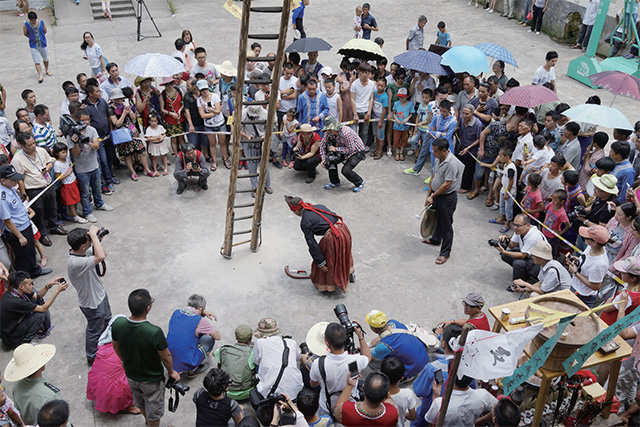 刀是真正带着利刃的刀,一把一把均匀地钉在木梯上,下方以红布覆盖。照例是冗长的祭祀和表演,法师头戴神额,身着红色长裙,手持龙角、灵刀、震铃,吹一阵,跳一阵,唱一阵,誓要吊足了看客的胃口才徐徐走向刀梯。我不错眼珠地盯着那双脚,踩过一层一层的利刃,毫毛未伤。在梯子的最高处,他还悠闲自在地从腰带上拔出了龙角,又来了一番煞有介事的表演。