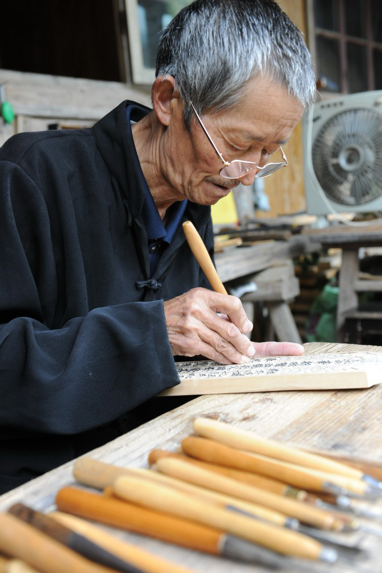 后来,我见到了67岁的蓝土成老人。他坐在木制的矮桌前,桌上赫然立着一块“非遗”文化传承人的牌匾,由丽水市政府授予。他所掌握的牌位雕刻技艺,即将面临失传。