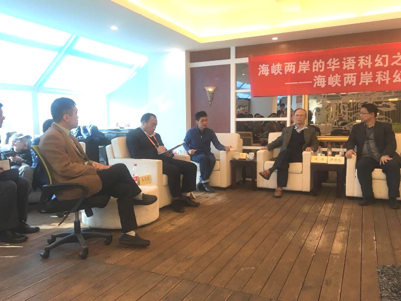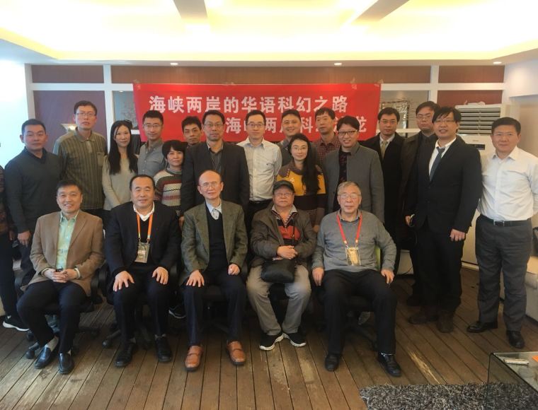 2017年11月18日上午,在北京嘉华世纪凤皇社举办了“海峡两岸的华语科幻之路”沙龙,该活动为“繁荣科普创作,助力创新发展”系列沙龙第十一期,由中国科普作家协会主办,成都时光幻象公司(中国科普作家协会单位会员)承办,疆君编剧工作室协办。来自台湾地区的以著名科幻作家黄海为首,有林健群、李知昂、林天中(石林散人)、陈厚岐(欧若奇)等科幻作家、学者,与大陆当代科幻界领军人物刘慈欣、吴岩、王晋康、韩松、董仁威、姚海军、何夕、陈楸帆、江波、吴显奎等进行了对话。海内外著名科幻作家、科幻理论家、翻译家、出版人刘宇昆、三丰、顾备、胡绍晏、赵晓旭、杨枫等也参加了交流。