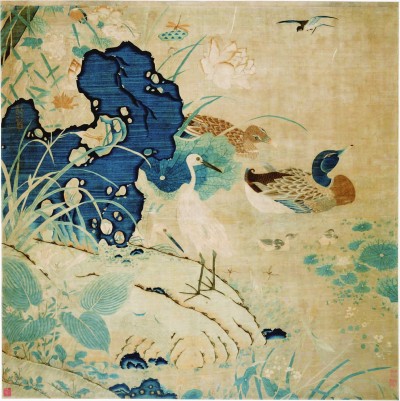 朱克柔 《缂丝莲塘乳鸭图》 是现存宋代缂丝画作中的上乘之作,它出自名家之手,流传有序,且幅式巨大,丝丝缕缕皆匀称适宜、层次分明。图中红叶白鹭,绿萍翠鸟,蜻蜓草虫,双鸭游乐,画面生动活泼,色彩富有变化。青石处有缂织隶书小款“江东朱刚制 莲塘乳鸭图”,下有“克柔”印一方。