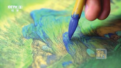 ▲中央美院的老师冯海涛在多年研究后用两个月复制了十分之一的《千里江山图》卷。他在节目中还原王希孟作画步骤,告诉观众——中华民族一代代都有藏朴守拙的匠人。他们守护瑰宝。因为他们,中华文明经五千年赓续不断,有了鲜活写照。图为冯海涛复制十分之一《千里江山图》卷的画面。(节目截图)