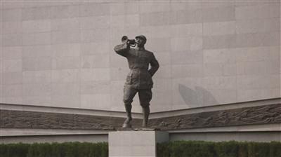 而位于纪念馆主体的门口那堵120米长的《胜利之墙》则是第四篇章,8米高的墙上一个大大的“V”字贯穿始终,底部昂首吹军号的中国军人脚踏日军的钢刀和头盔,“V”字一边是黄河在咆哮,中国军民“大刀向鬼子们的头上砍去”,另一边是滚滚长江奔腾不息,胜利的部队凯旋南京。