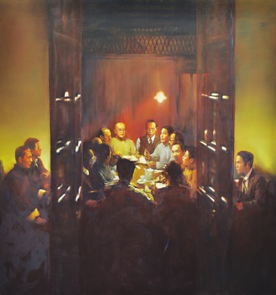 《曙光———中国共产党的诞生(上海)》中共一大会址纪念馆常设展中以中共一大第一次会议为主题创作的油画(局部)李鹏绘