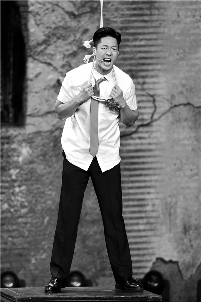 另一段则是凌潇肃冲上桌子准备上吊时,吼起了那段关中民谣:“他大舅他二舅都是他舅,高桌子低板凳都是木头,金疙瘩银疙瘩还嫌不够,天在上地在下你娃甭牛。”凌潇肃透露,这是原剧本中没有的,也是他自己加入的“神来之笔”。他说,在排练前他专门看了一遍《最爱》电影,片中郭富城演这场上吊戏的时候很写实,但在转换成戏剧演出时,从床边快步走上桌子,再拉着绳子上吊,整个过程没有对话,他觉得太干了,太浪费这个距离了,只凭借肢体动作也根本表现不出人物这时候的心情。于是他想到了在演《关中匪事》时经常哼唱的这首歌谣,顿时觉得非常合适。