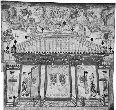 此次展览中单体面积最大的一件展品是《忻州九原岗北朝壁画墓墓道北壁壁画》,它长3.2米,高3.5米。壁画中绘有一座规模宏大的木结构建筑,建筑中华丽的门楼、庑殿顶、复杂的斗拱、重复的额枋、特殊的瓦钉、彩色的铺地砖,建筑中的一砖一瓦都生动、逼真,特别是双柱式的斗拱在以往的资料中未曾见过。这是首次在同时期墓葬壁画中发现木结构建筑,让电竞竞猜有幸第一次在壁画中领略北朝建筑的风采。