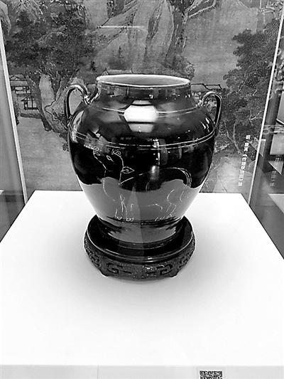 浇黄釉为颜色釉之一种。中国陶瓷原以青釉为自然瓷色,肇因于瓷土中多含铁元素,制釉时难以尽除,只得因势利导,成就一番青瓷的如冰似玉。后于长期窑冶之中,渐得黑、白、酱等釉色,亦偶见红、绿色彩,然而终不过寥寥数色而已。至于明代,官方于景德镇投入甚多,历朝多有创造,颜色釉瓷器遂层出不穷,瓷器釉色由此方争奇斗艳。弘治朝除以浇黄釉闻名外,颜色釉瓷器方面亦有其他紫金蓝釉、孔雀绿釉等颜色釉产品,还创烧有深茄皮紫釉瓷器。展厅中以一独立展柜陈列有茄皮紫釉描金牛纹双耳尊(图4)。此器紫中泛蓝,釉质肥厚,器体规整雍容,为弘治朝瓷器中之佳作。