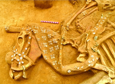 河北行唐故郡东周遗址车马坑里用海贝装饰的马