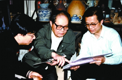 冯其庸(左)翻看周宏兴(右)出版的大理石画册连称神奇