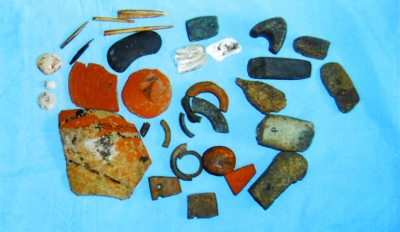 在北堡寨村拾得的彩陶、石器、骨器、蚌器的残片和遗物。