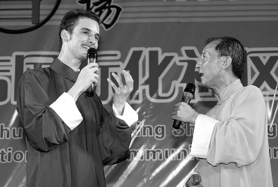 2005年7月5日,丁广泉与法国弟子朱利安为社区居民表演相声。新华社图