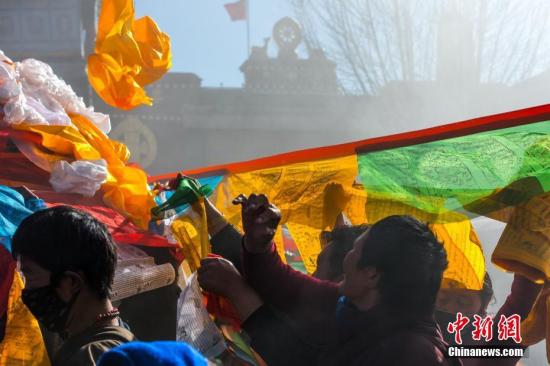 6日为藏历的12月21日,是大昭寺按照天文历算选出的吉日。该寺工作人员依照顺时针为经幡柱更换新经幡,以迎接藏历新年。五根经幡柱分别位于八廓街的东北、东南、西南方以及大昭寺前方的左右侧。