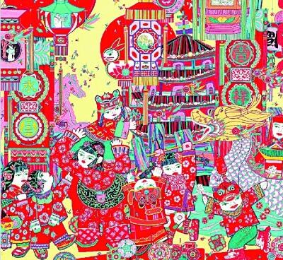 纸上乾坤大,画里岁月长。美术文化在中华传统年节文化中一向扮演着重要角色。它与各种节俗交织在一起,在表达百姓祈福心愿、满足大众审美需求、记录民间年节习俗的同时,也使节日变得有文化起来。作家老舍的描述颇具代表性,三句话便拉近了吃穿与文化、与美术的距离:“除夕真热闹。家家赶做年菜,到处是酒肉的香味。男女老少都穿起新衣,门外贴上了红红的对联,屋里贴好了各色的年画。”春节中的美术创作也使得一些美术名家从小就与书画结下了不解之缘。徐悲鸿10岁时就开始为乡里人写“时和世泰,人寿年丰”等春联,这种百历锤炼的童子功为他后来成为书画大家奠定了坚实的基础。丰子恺在谈到自己和美术的缘分时曾说:“祭品盘上的红纸盖都是我的姑母剪的,‘福禄寿喜’‘一品当朝’‘平升三级’等字,都剪出来,巧妙地嵌在里头。我那时只有七八岁,就喜爱这些东西,这说明我与美术有缘。”
