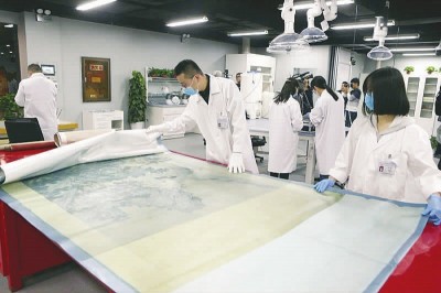 一面超大的电子监控屏,将130平方米空间的角角落落展露得真真切切;三个形同无影灯的大罩灯下,大红漆案上平铺着一幅待修的清代《百鹿图》;西墙上,是慈禧太后御笔《岁岁平安》朱砂拓片,北墙上是正在修复的一幅《福禄图》……几位戴口罩的修复师正在小心翼翼地侍弄着……
