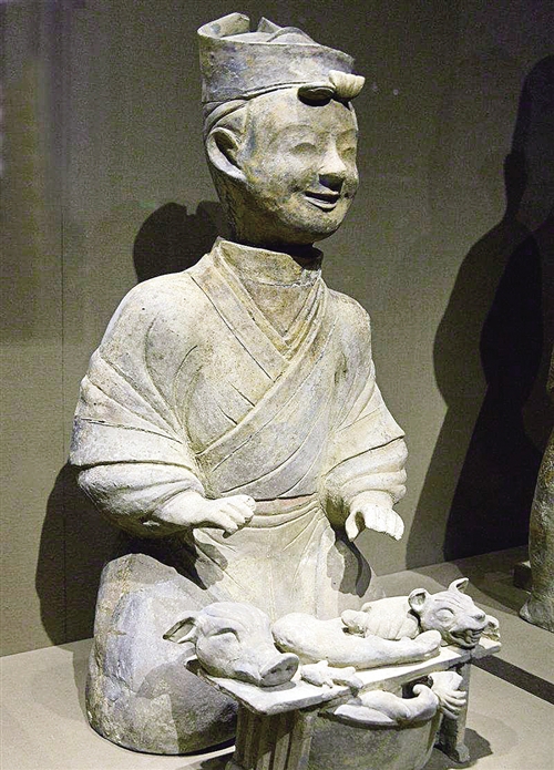 出土于天府之国四川的汉代庖厨俑的案头摆放着一只“食狗”。作为原始部落的主要食物之一,狗最初是作肉用的。《礼记·曲礼》有云“凡祭宗庙之礼……鸡曰翰音,犬曰羹献。”据《周礼·天官》记载,当时狗肉已是美味的“六膳”(牛、羊、豕、犬、雁、鱼)之一。