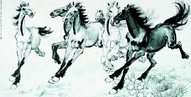 他22岁时学书于康有为,勤练《石门铭》《张猛龙》等碑,客居海外时仍苦临魏碑。甚至在其重病之时,床头还展放《散氏盘》,作为镇病“良药”把玩不已。由于他在书法上的酷嗜、钻研与思考,形成了飘逸自如、清雅从容的书风,兼收并蓄帖、碑之内涵,将内敛与超迈、散淡与拙朴、灵秀与厚重等中国艺术形式要素进行了成功的融合。并化厚为朴,变繁为简,集巧为拙,以柔驱刚,将写意与书写、画意与笔意、中锋与变锋不着痕迹地表达出来,成为自己一以贯之并不断拓展的风格。徐悲鸿更以之为原动力,以书入画。画作的线条浑穆而深沉,从容而矫健,凝练而拙厚,潇洒而壮实,墨舞神飞而真气远出。表现在画马上,使其笔墨兼具光影变化与结构特征,筋骨、肌肉突出,蹄、鼻、关节等部位的细节描绘精炼而恰到好处。鬃、尾的表现更被开拓到豪壮境地,飞舞开张,笔墨当风,气势如虹,神采超然,是一种交响乐式的笔墨之响,是一种饱含着激情与斗志的精神迸发!因此,这些画中之马,其奔、其走、其立、其食、其集、其散,均是人格之象征,精神之比拟。它们不配鞍缰,不受约束,不加羁绊,自由而行。骨骼粗大,筋骨强壮,鼻孔开张,关节突出,一身的铮铮铁骨,满怀的驱驰豪情,活脱脱地天马行空。徐悲鸿以此等气概的马象征民族精神与国家气象,产生了史无前例的文化功效,使马的艺术价值与社会意义拓展出广泛的传播空间。
