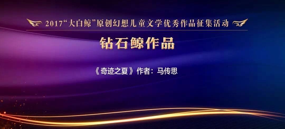“大白鲸”原创幻想儿童文学优秀作品征集活动的目标是“保卫想象力”,目前已举办五届。2017年度征集活动共收到来自中国27个省市以及美国、德国、新加坡、马来西亚等国家和地区的近500位作者的538部作品。作品全程匿名,由评委投票选拔。最终,中国少儿科幻作家马传思凭借作品《奇迹之夏》摘得本届原创幻想儿童文学奖最高奖“钻石鲸奖”。杨紫汐和龙向梅,分别凭《星空街39号》和《生气的小茉莉》获得“玉鲸奖”。蓝钥匙的《兔子的平行世界》、安小橙的《芃娜的小屋》、王林柏的《拯救天才之扁鹊篇》等11部作品和7部原创图画书作品获“金鲸奖”和“银鲸奖”。