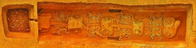 2016年10月,考古工作者发现了河北省有史以来形制规格最高、保存最为完好的战国车马坑——五车十六马的豪华阵容,马匹的装饰也是极尽奢华,头部装饰有雕刻成葵花(状)装的骨(泡),马鼻部位均扣着贴有金箔的铜泡,精致的贝类通过皮条贯穿马的身体,鲜红明艳的车漆依旧显露着来自2000多年前的雍容华贵。