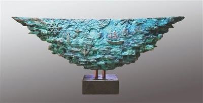 海南大学副教授、海南省雕塑艺术学会副秘书长张睿就是其中一位。此次,他带来的展品是《丝路》。“作品使用抽象和具象相结合的形式,表现了‘一带一路’的主题,体现丝绸之路和航海精神。外形看起来像张开的翅膀,又像船身旧船木,又像一个瓷碗等,倒三角形的外形增强雕塑的形式感。雕塑的两面主要表现了地图、帆船等,锚、舵等航海元素,以及渔民和海洋元素等。色彩用了深蓝绿和古铜色,跟主题呼应。”张睿告诉记者。