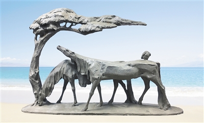 在博鳌金湾的沙滩上,一座树脂雕塑作品《长空横海色》,引来不少游客驻足。作品表现一对轮廓秀丽的骏马悠然漫步在海边,一匹马仰头看着天边的落日,另一匹则紧紧依偎其身旁闲适地垂头吃草,天边的海平线在余晖的渲染下显得更加平和宁静,此时此刻,雕塑与环境融成了一个整体……