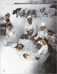 感悟罗江的艺术生命,可强烈体会到彝族人家国一体的新时代情怀。他在娴熟运用黑、白、灰墨色外,还善用褚红色、蔚蓝色、浅绿色、淡黄色,将各种颜色协调有度、变幻无穷,做到新奇而不俗、夸张而不艳,既烘托了中国画大写意的风格,又深化了对时代、对生命的敬畏。同时,他注重将新时代主题巧妙融会到艺术生命体系之中,牢牢掌控艺术走向与情趣,给作品赋予深刻热烈的思想高度,让每一幅作品都体现出对生活的挚爱、对生命的敬重、对祖国的责任。系列作品《乌蒙山》用豪迈凝练的大写意手法,描绘不同生活状态下彝族女人与牲畜的关系,表现出道法自然、天人合一的东方智慧。大型主题创作《誓盟》用细腻深刻的艺术风格,讲述云南26个民族代表一心一意听党话、跟党走,为建设平等、自由、幸福的民族大家庭而奋斗的美好故事,体现出了火热的民族情怀和爱国主义精神,具有厚重的精神内涵和审美价值,也树立起艺术服务人民、讴歌时代的鲜明导向。