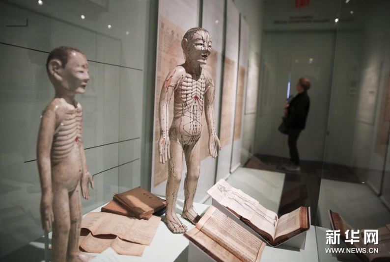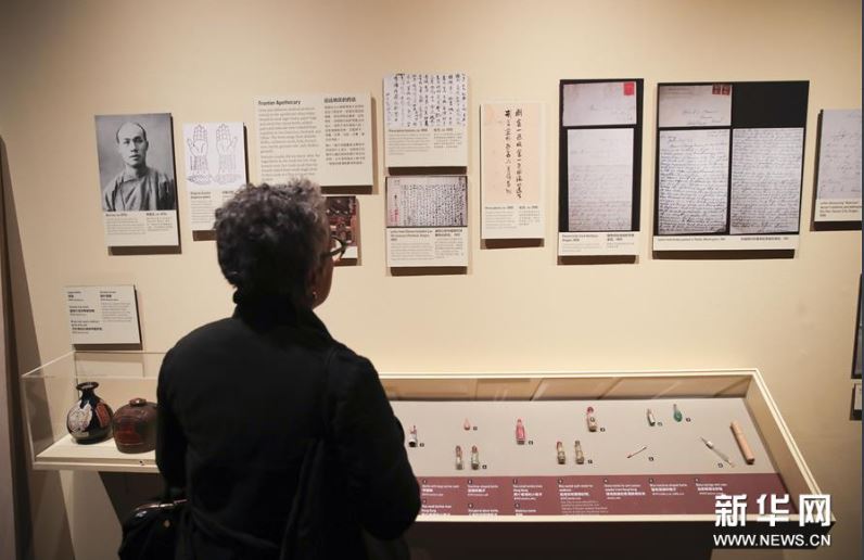 4月25日,在美国纽约华人博物馆举行的“中医在美国:理念、人与实践的融合”主题展媒体预展上,观众观看展品。美国华人博物馆25日首次推出反映中医中药在美发展历程的大型展览。展览从26日起对公众开放,并将持续至9月9日。
