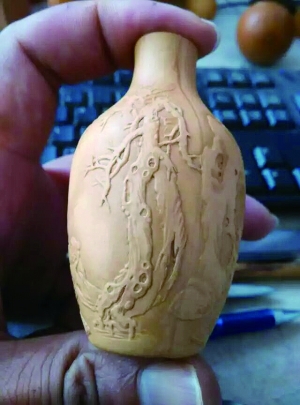 很快,徐连龙感觉到了不足,“过去的葫芦砑花特别贫乏,就会做一些柏树、草花等图案。”如何丰富创作素材,让徐连龙犯了难,“后来我在一本画册上看到刘守本先生的内画鼻烟壶,觉得这些图案特别适合移植到葫芦上。”就这样,1991年,徐连龙找到内画鼻烟壶大师刘守本,拜他为师学习内画。靠着师傅的指导和自己多年的揣摩,徐连龙总算在葫芦上砑出了层次丰富、图案精细的人物画,“将里边的石头、树做出了浮雕效果,大家都觉得特别新鲜,也带动了市场上的人物画题材。”