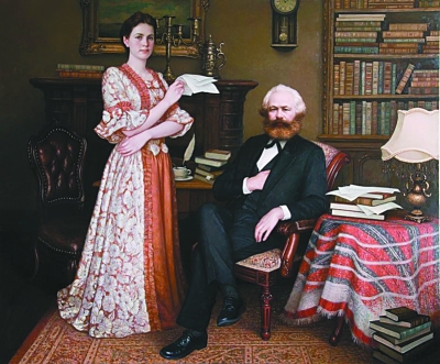 “马克思题材绘画作品创作”是美术界为纪念马克思诞辰200周年而推出的一项重量级献礼活动。此项活动由中央编译局、中国文联主办,中宣部理论局和文艺局参与,中国美协承办。活动围绕马克思生平的重大历史事件和重要人生节点,请各地美术家以油画和国画为表现形式创作了24幅马克思题材作品。在今年年初举行的“马克思题材绘画作品创作工作会”上,中央编译局的专家和北京大学、南京大学的教授也参与其中。在创作过程中,中国文联、中国美协的领导和马克思研究专家还走进部分美术家的工作室进行观摩指导。根据中国美协提供的作品名录来看,从《马克思童年时代的特里尔城》到《写作〈共产党宣言〉》,从《在伦敦德意志工人教育协会作报告》到《〈资本论〉在工人之间传播》,从《在国际工人协会(第一国际)成立大会上》到《满腔热情支持巴黎公社》,从《晚年关注俄国和东方经济落后国家的发展道路》到《延安时期学习马克思主义蔚然成风》,24幅作品基本上按照时间脉络排列,其中群像型作品占比较大。冯远的中国画《在国际工人协会成立大会上》呈现出一种蒸腾的动感,现场气氛令人激动,工人们将帽子抛向了空中,这是一种多少文字也写不出的热烈场面,让人真正感受到了美术的力量。刘大为的中国画《马克思、恩格斯与工人代表们在一起》描绘了马克思、恩格斯到工厂考察调研的情景,领袖和工人打成一片,让人读出了思想与劳动结合在一起的神圣。苏州科技大学传媒与视觉艺术学院的王嫩教授是江苏唯一受邀参加“马克思题材绘画作品创作”的艺术家,因而受到了当地新闻媒体的广泛关注。据《姑苏晚报》等媒体报道,今年1月5日,王嫩受邀赴京选定题目《终身伴侣》,回苏州后一个月闭门创作初稿,2月5日再赴京接受中央编译局专家审稿“挑刺”,通过审核后即赶回苏州加班加点,连大年初一都在进行创作。上个月中央电视台《不朽的马克思》专题片摄制组曾前往苏州王嫩工作室进行现场采访,北京电视台亦专程赴苏跟踪拍摄创作进程。