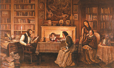中央美术学院教授孙景波已经74岁,是参与创作的画家中最年长的。他说:“电竞竞猜这代人是在马克思主义的信仰下成长起来的。马克思主义解放全人类,改造旧世界,建立世界大同的革命理想,是我所信仰和追求的。我年轻时读马克思传记,了解到马克思为实现推动人类进步孜孜以求的精神和马克思家庭浓郁的亲情人文氛围。对此有着深厚的情结。因此这次创作,我主动选择画马克思一家人在书房里朗读莎士比亚诗歌的场景,表现马克思作为学者、诗人、丈夫、父亲的一面。”孙景波的这幅《革命的一家人》,采用电灯发明之前、烛光的用光,充满明暗虚实的神秘感和亲情的温馨,衬托出一个书香家庭诗的意境。场景选择的时间节点是1865年,马克思、夫人、长女、二女儿和幼女全家相聚的时刻。