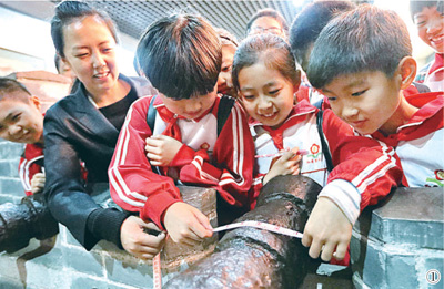 17日,河北省秦皇岛市和安里小学组织学生走进当地的山海关长城博物馆,孩子们在聆听讲解中,近距离学习长城的相关知识,并体验文物保护测量等趣味活动,感受中华历史文化。 图为孩子们在工作人员的指导下体验文物保护测量。 史自强 曹建雄摄影报道