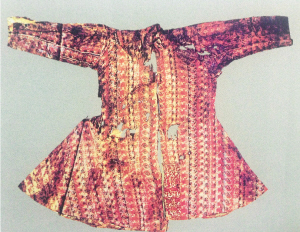 1959年,民丰县尼雅夫妻合葬墓出土了东汉时期“万世如意”汉字铭文锦袍。这件保存较为完好的锦袍,出土时色彩十分鲜艳。袍服身长122.5厘米,款式为“胡服”:直领、对襟、窄袖、紧腰、宽踞,其侧加缝一块三角衣料,增加了下摆的宽度。袍的领襟和下摆用绣有“延年益寿大宜子孙”的铭文锦制作。锦袍质地厚实,以绛紫色为底,配有淡兰、油绿、白色的茱萸纹和飘逸的云纹。