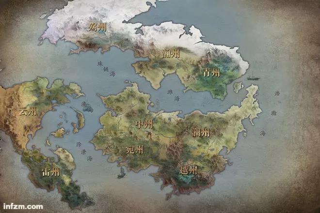 这是小说《九州缥缈录》着墨最多的三个州。在新版地图里,九个州融汇了现实世界的典型地貌和气候。“宁州是森林,澜州是苦寒雪国,越州是南蛮沼泽,殇州雪山,雷州雨林,云州是少有人迹的地方。”读者西陵曲驾轻就熟地总结道。