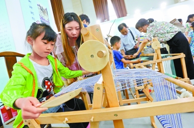 前天在农展馆1号馆内,一名小朋友在指导老师的点拨下,体验土布纺织技艺。